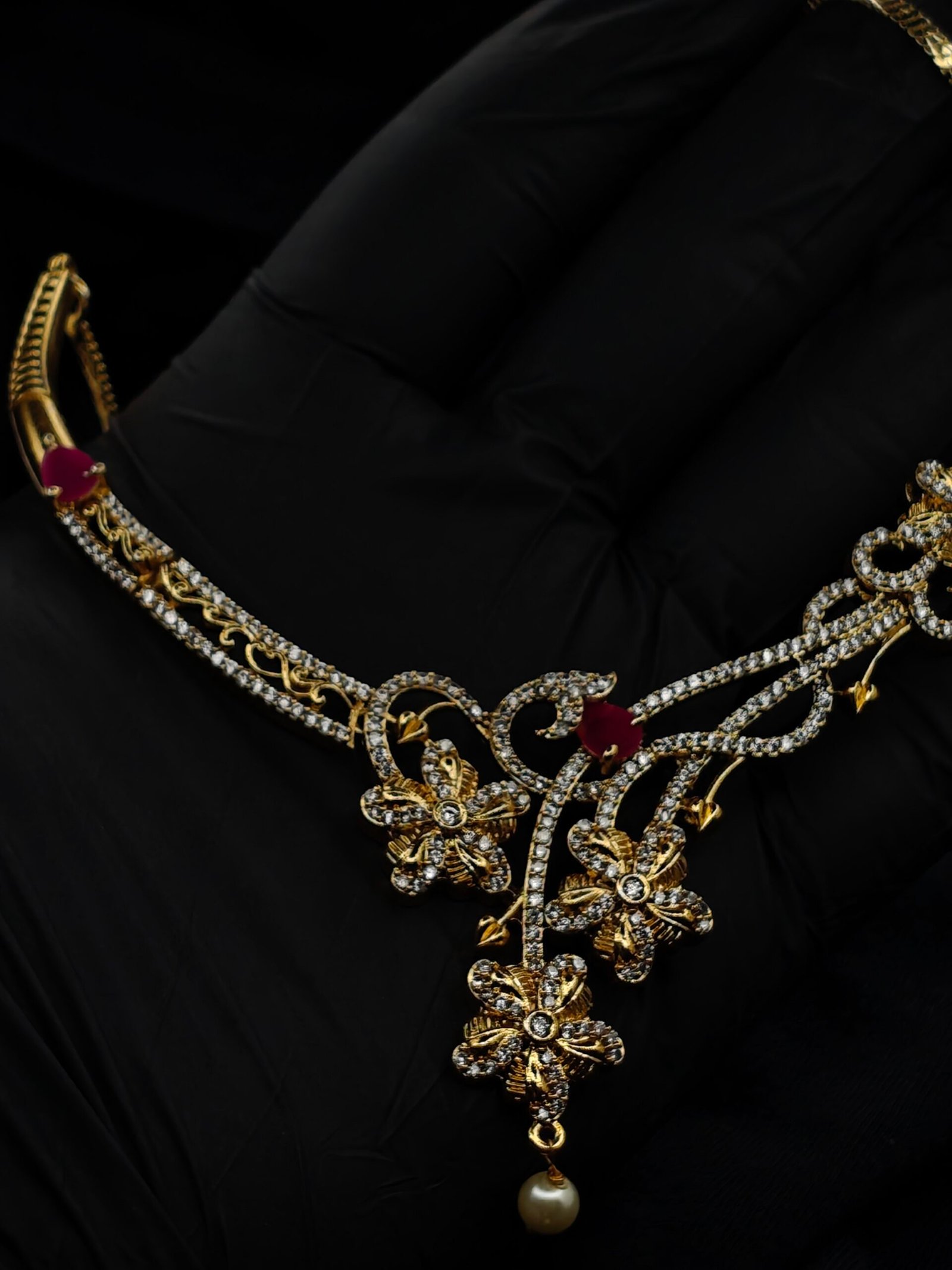 The centerpiece showcases delicate floral motifs embellished with shimmering crystals, perfectly complemented by subtle red stone accents that add a hint of color and sophistication. A graceful pearl drop at the bottom enhances its classic appeal, giving the piece a refined and luxurious finish.