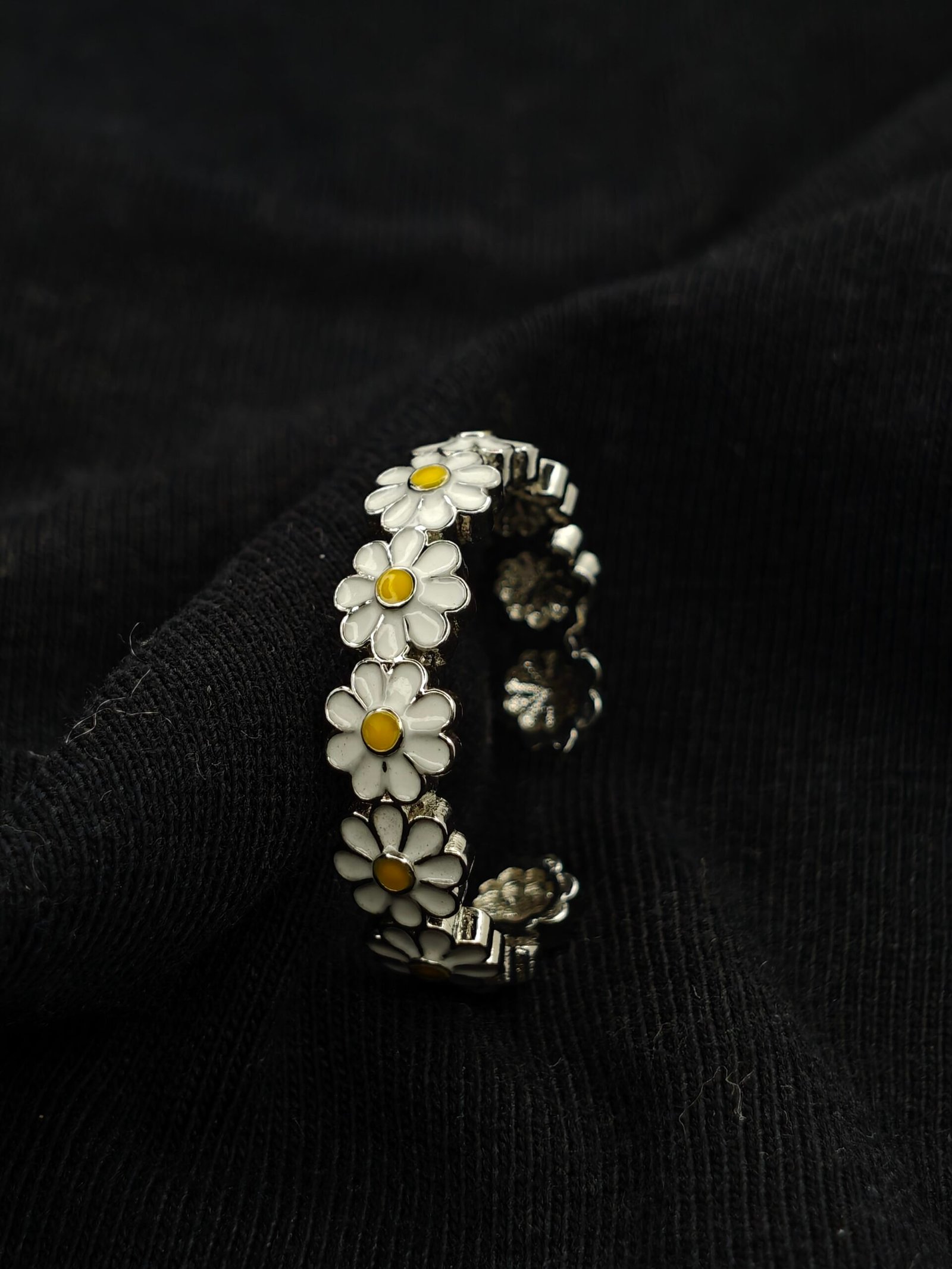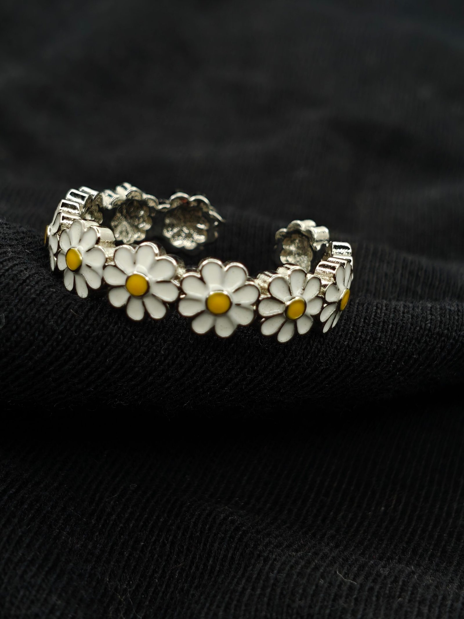 White enamel flowers with vibrant yellow centers, this ring captures the essence of fresh blooms in a timeless design.