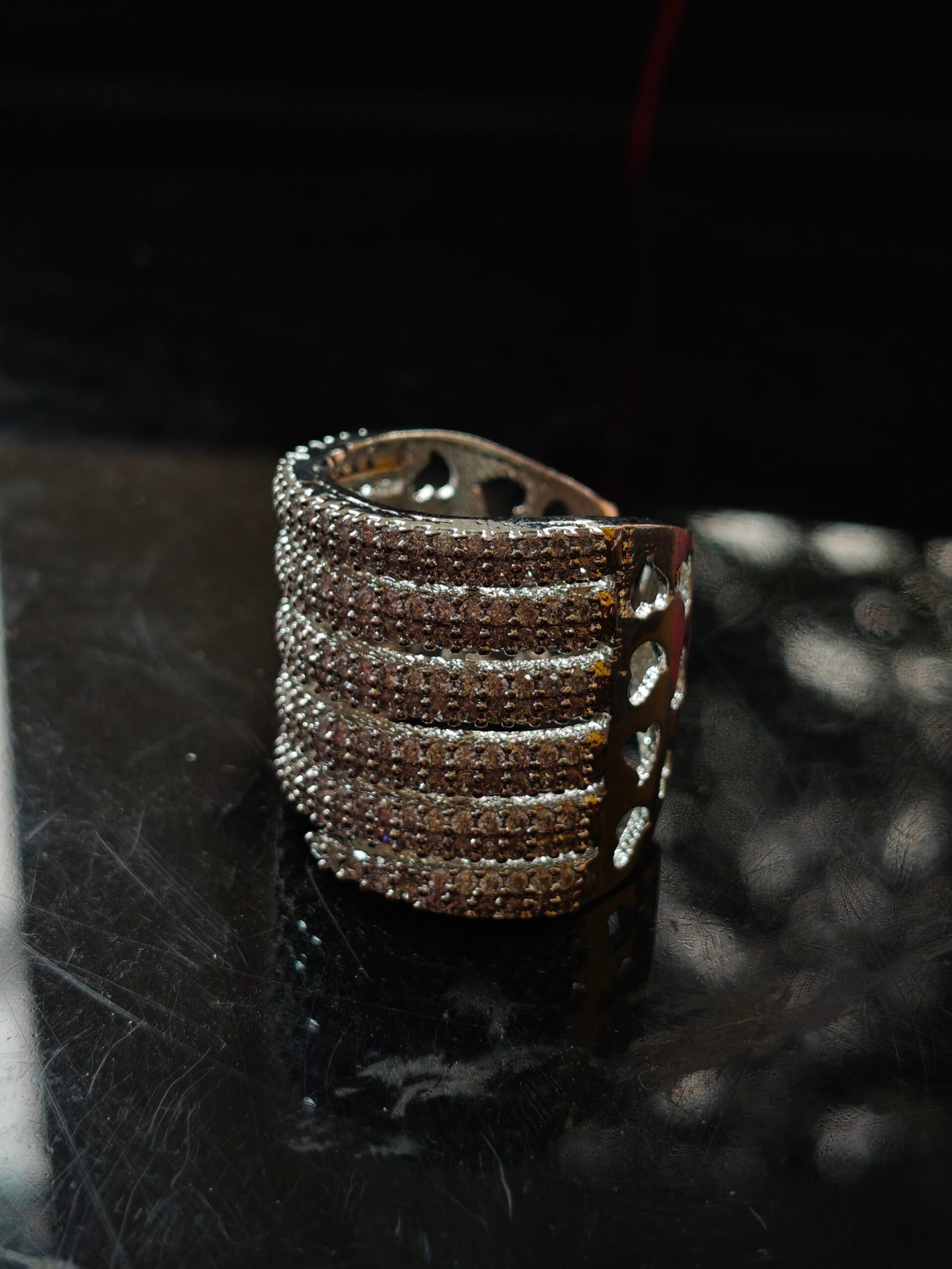 Make a refined style statement with this elegant multi-row statement ring, designed to deliver maximum brilliance with a contemporary edge. The ring features multiple parallel bands, each meticulously set with high-shine clear stones that create a seamless, pavé-style sparkle from every angle. The layered design gives the appearance of stacked rings while offering the comfort and convenience of a single piece.