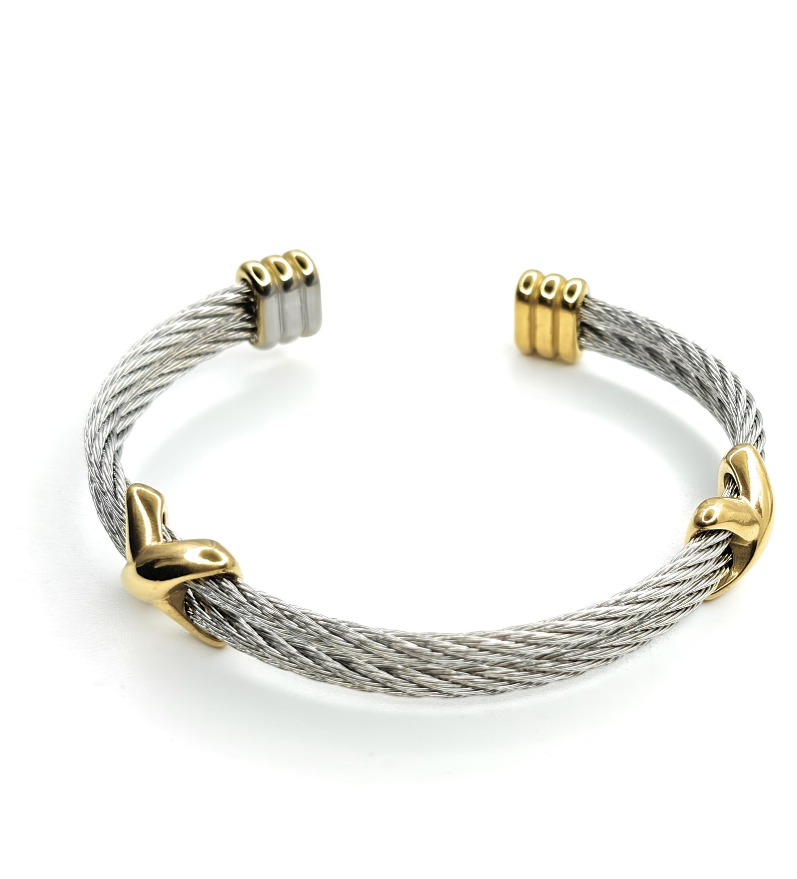 Elevate your everyday style with this sophisticated dual-tone cable cuff bracelet. Designed with intricately twisted stainless-steel strands, this open cuff features elegant gold-tone accents that add a refined and contemporary touch.