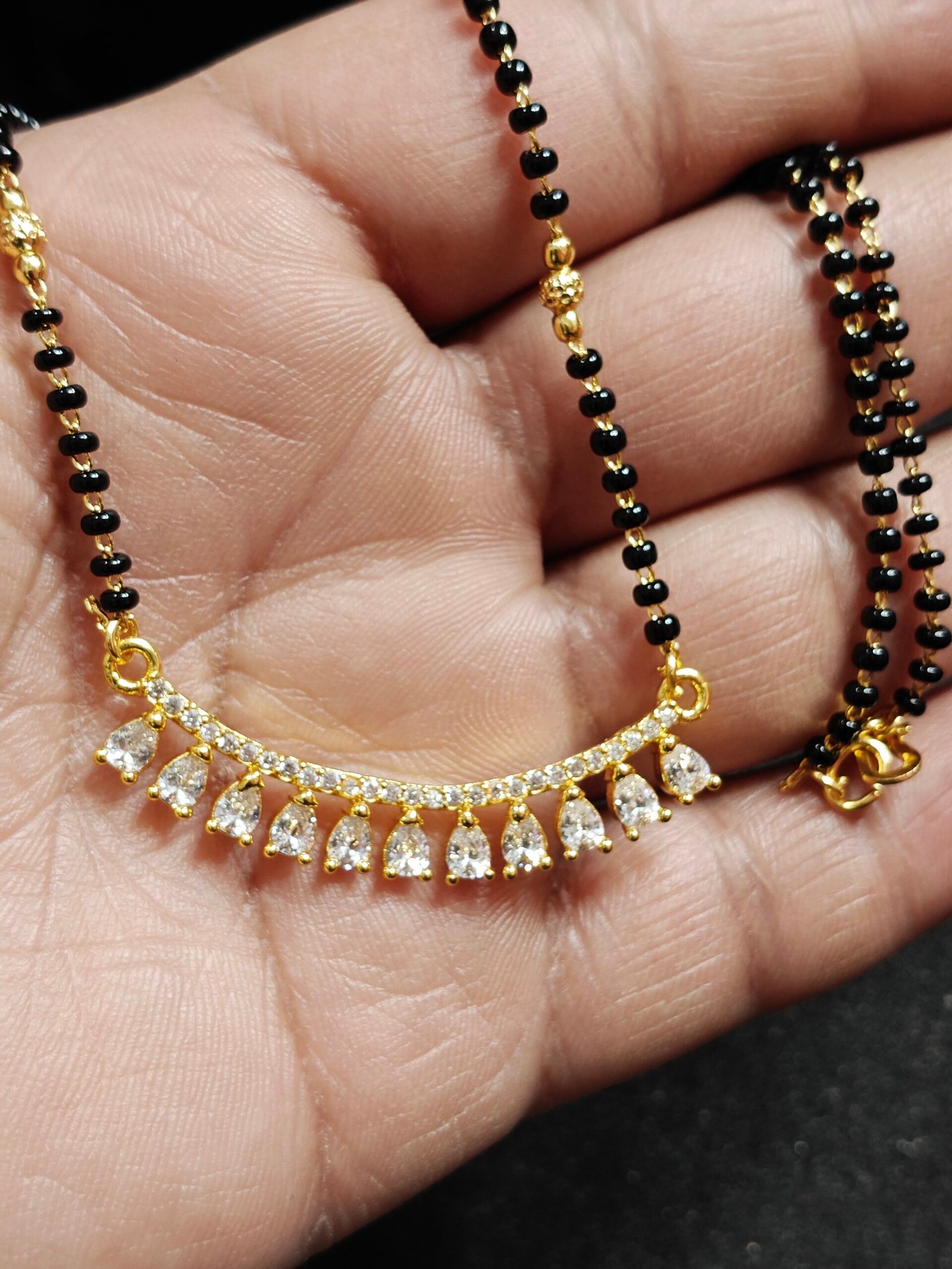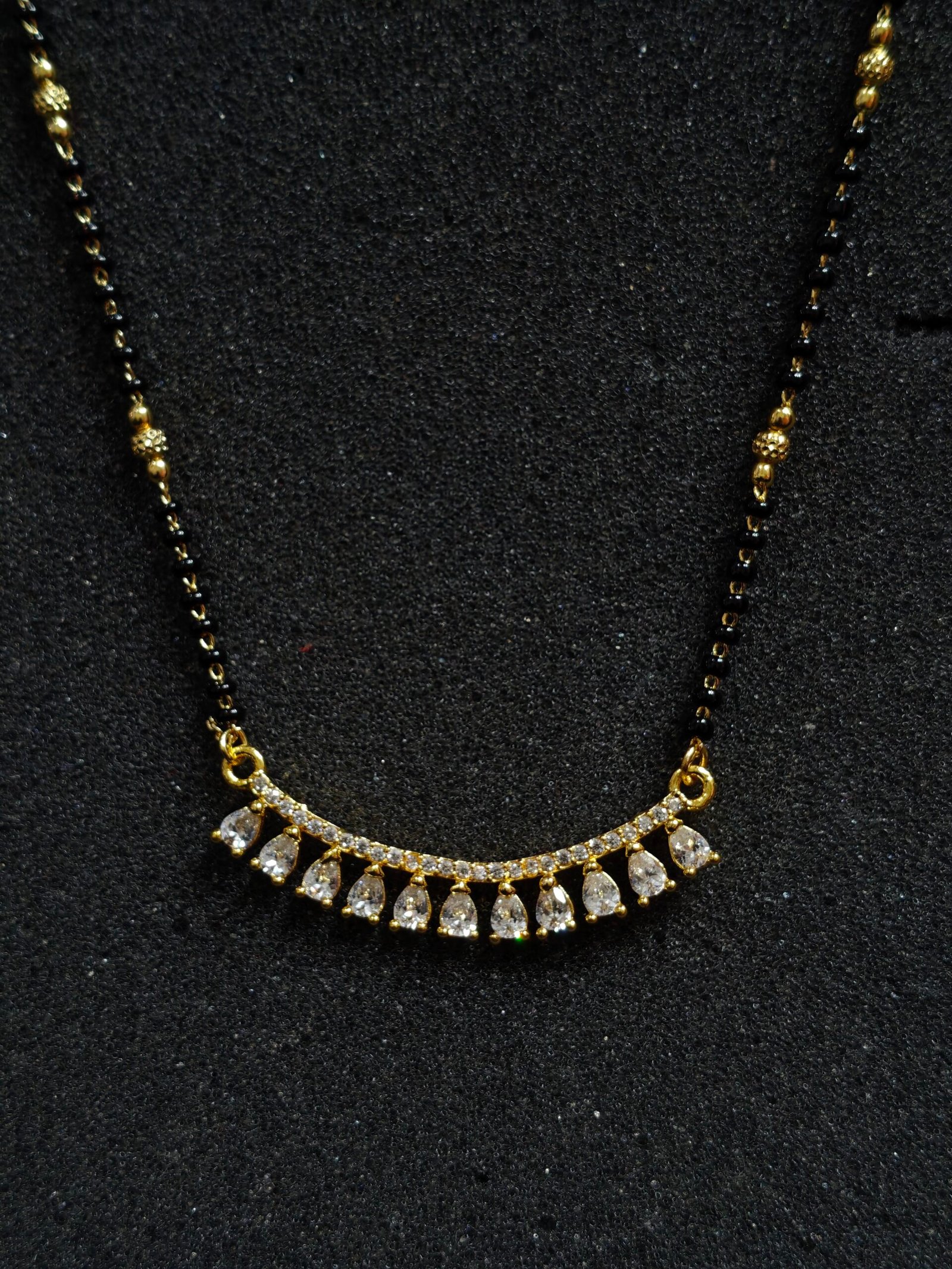 Add grace and sparkle to your traditional look with this Elegant AD Drop Mangalsutra Necklace. Crafted with a delicate black bead chain, this mangalsutra features a beautifully curved pendant embellished with shimmering American Diamonds. The pendant is highlighted with multiple teardrop-shaped AD danglers that create a graceful cascading effect, giving the necklace a luxurious and eye-catching appeal.