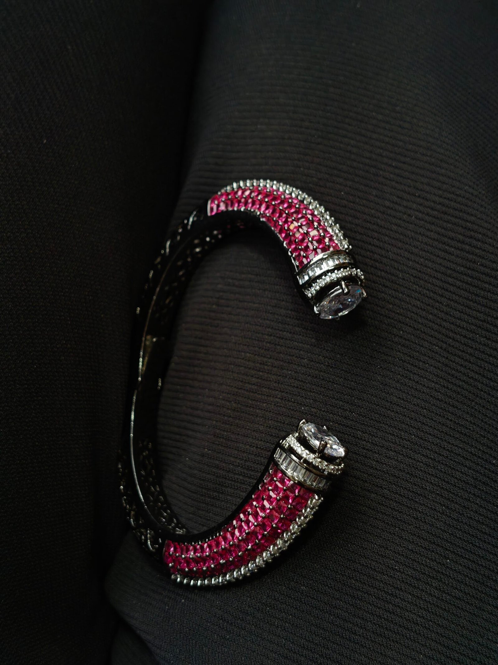 Add a bold touch of elegance to your jewelry collection with this exquisitely crafted open cuff bracelet. Designed to make a statement, the bracelet features a sleek black base accented with densely set ruby-pink stones, bordered by shimmering clear crystals for a luxurious finish. Both open ends are crowned with prominent solitaire-style stones, encircled by fine crystal detailing that enhances brilliance and sophistication.