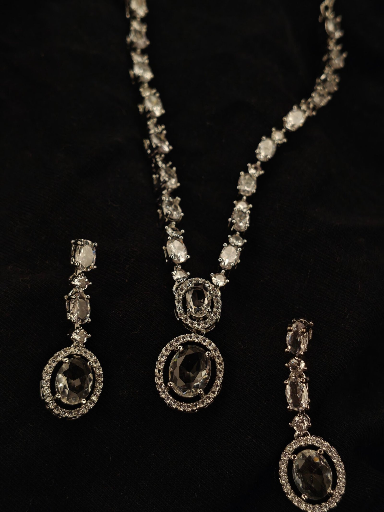 Beautifully crafted necklace and matching drop earrings. Designed with sophistication in mind, each piece showcases stunning oval-cut smoky crystals, surrounded by delicate halos of shimmering stones that catch the light from every angle.