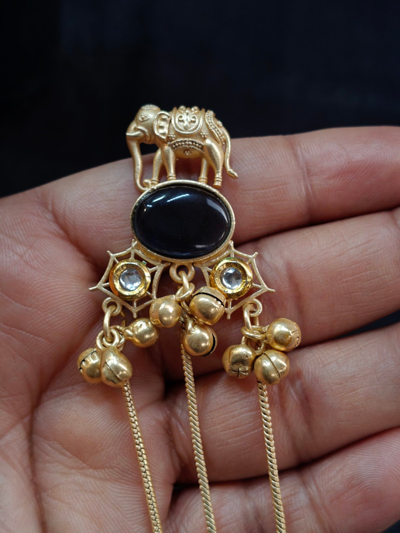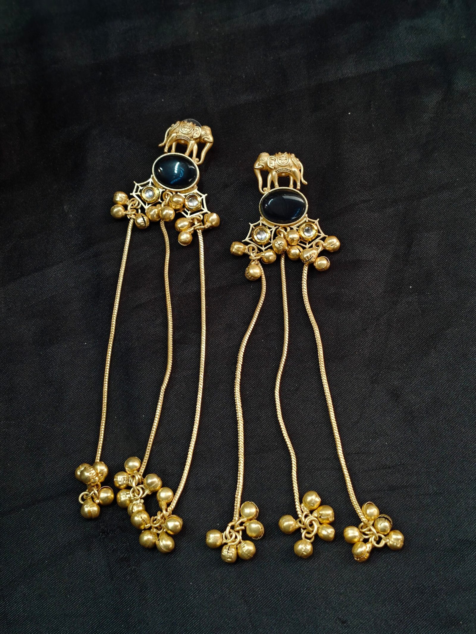 The design is enhanced with a stunning oval black stone centerpiece surrounded by intricate gold-toned detailing and small crystal accents. Flowing chains with charming bead drops create graceful movement, giving the earrings a luxurious and eye-catching look.