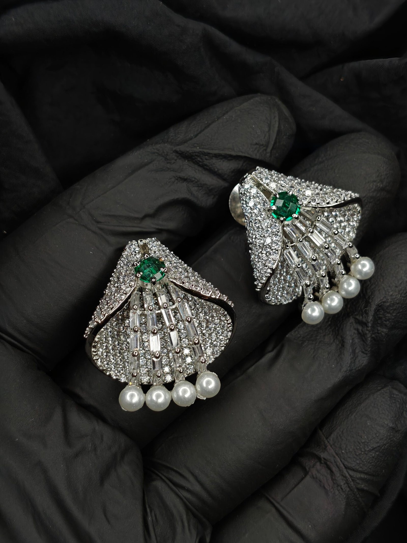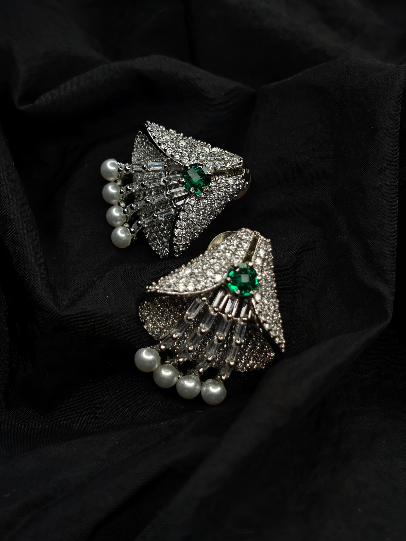 The fan-shaped silhouette is enhanced with cascading baguette-cut stones, adding depth and brilliance, while delicate pearl drops at the base bring a timeless touch of grace and movement. Finished in a sleek silver-tone setting, these earrings are perfect for elevating both traditional and contemporary looks.