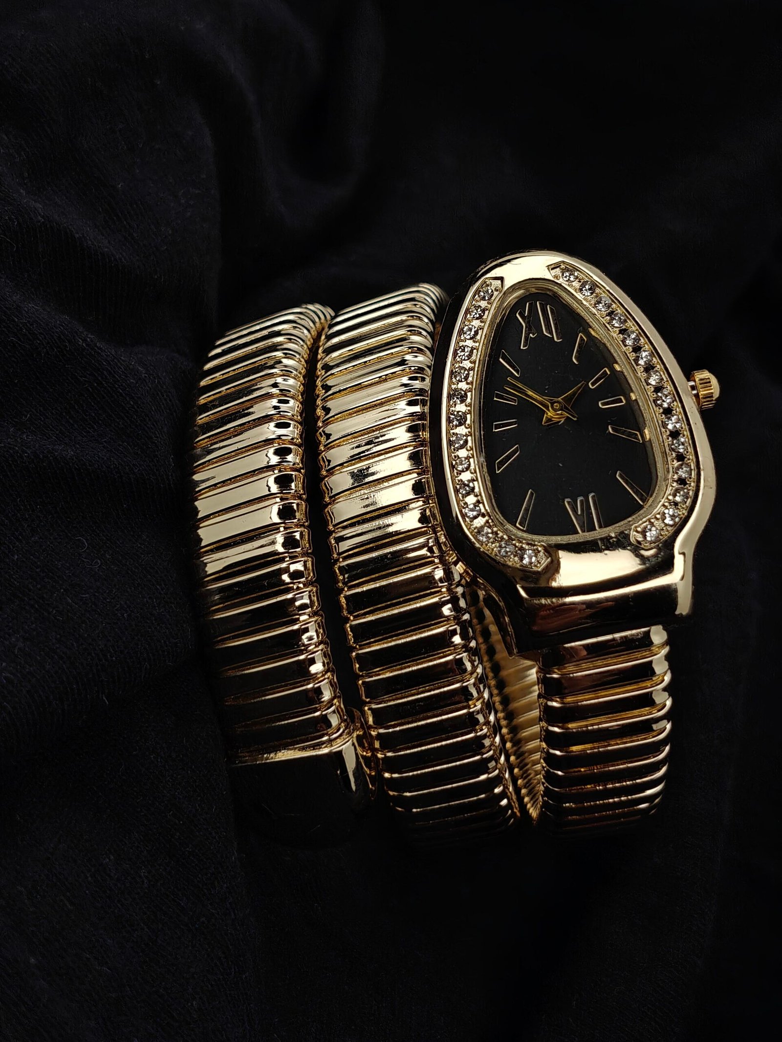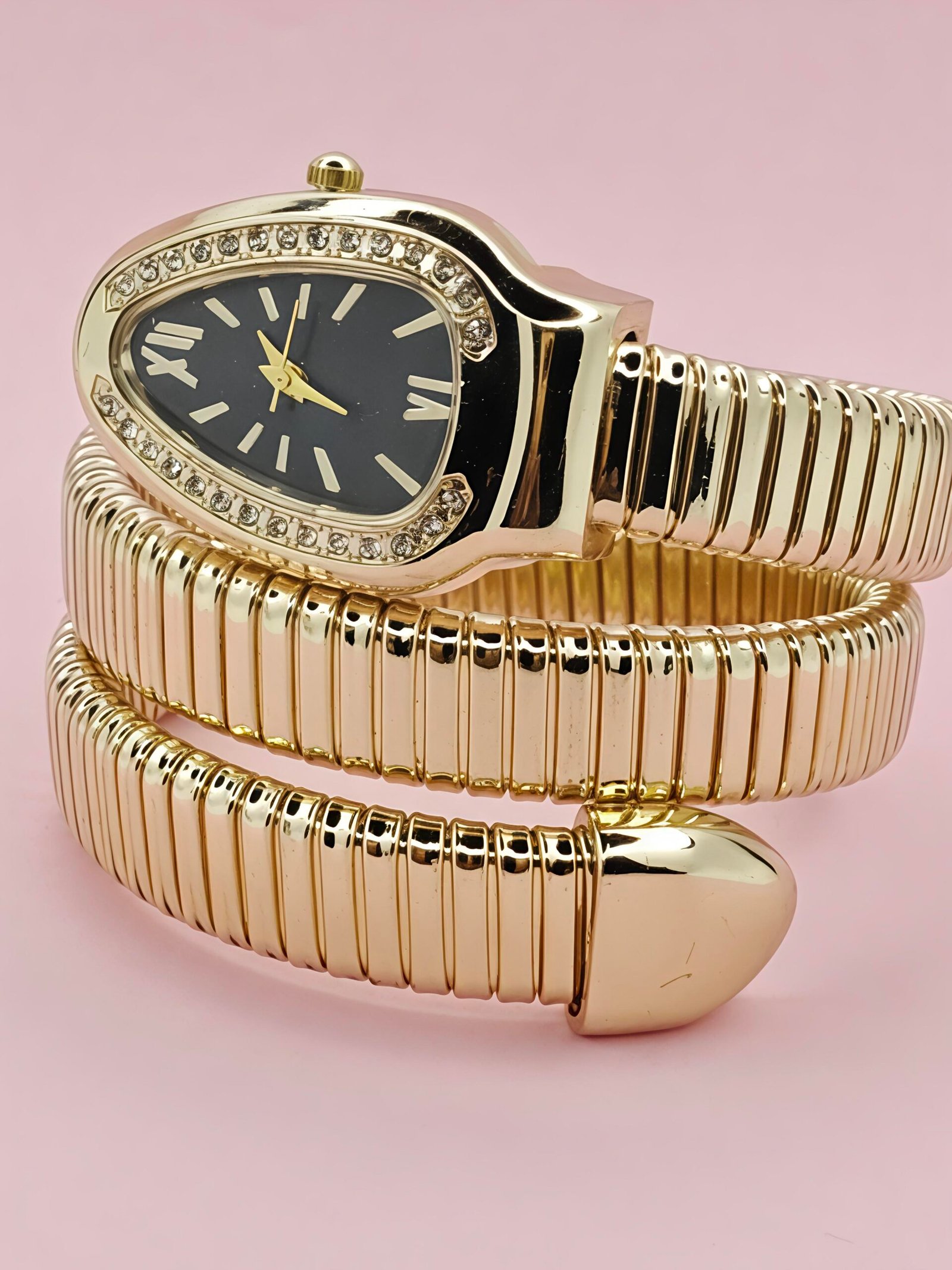 luxurious gold-tone finish, this watch is crafted with a flexible coiled bracelet that wraps gracefully around the wrist, creating a layered, bracelet-inspired look. The polished metal design offers both durability and a comfortable, adjustable fit.