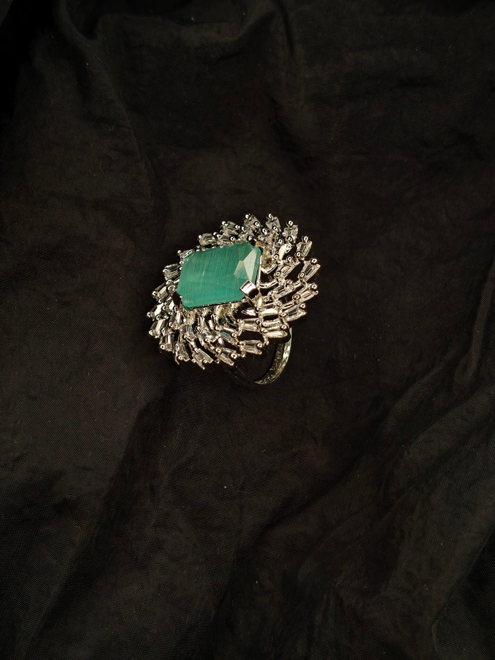 Elevate your jewelry collection with this striking statement ring, designed to captivate from every angle. At its center sits a bold, emerald-cut green gemstone, radiating a rich, elegant hue that instantly draws the eye. Surrounding the centerpiece is an intricate halo of shimmering baguette-cut stones, arranged in a dynamic, sculptural pattern that adds brilliance and depth.