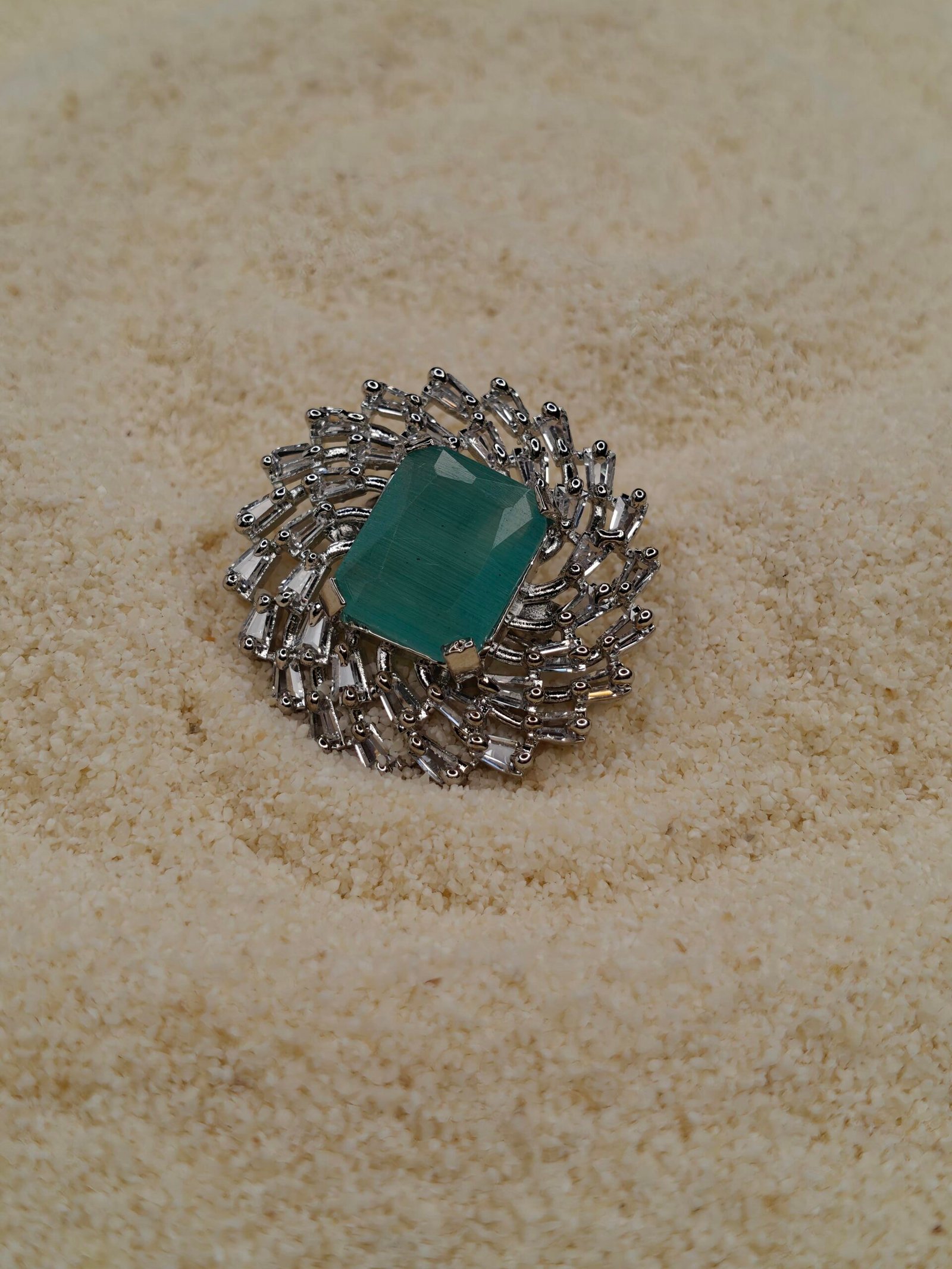 Crafted with a polished silver-toned band, this ring balances modern sophistication with timeless glamour. The elevated setting enhances the gemstone’s presence, making it perfect for special occasions or as a standout everyday luxury piece.