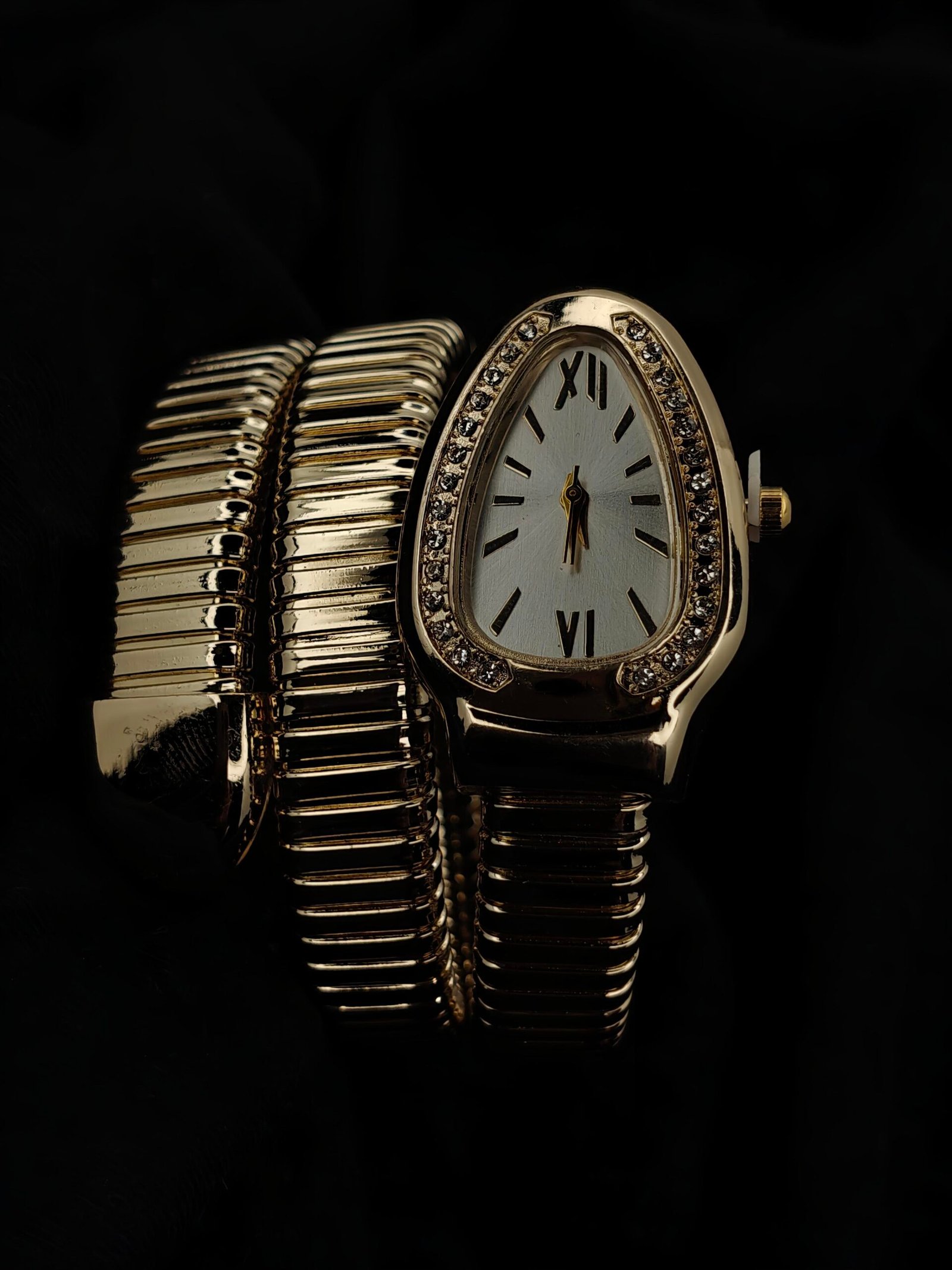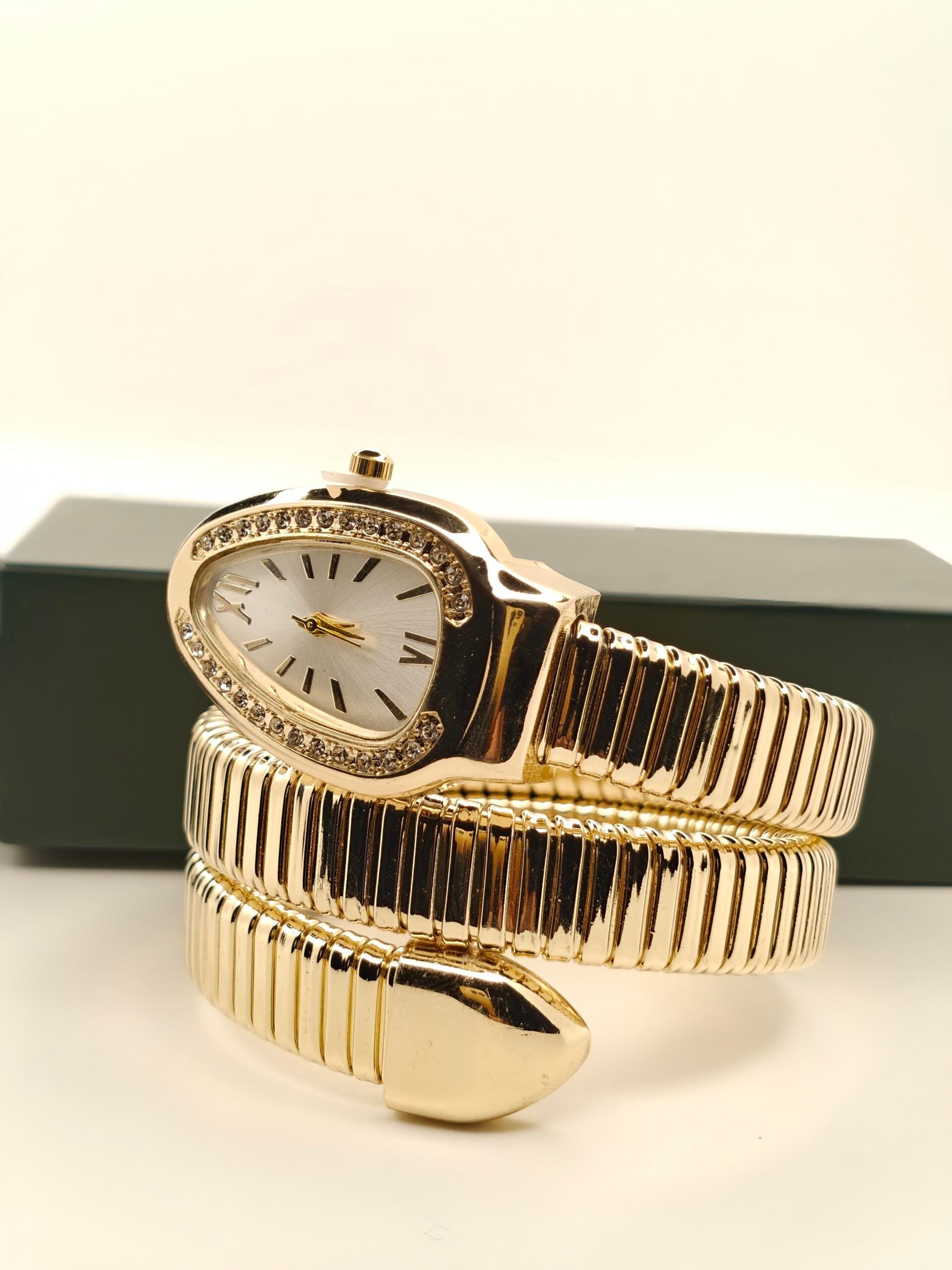 Unique oval-shaped dial, the watch is adorned with sparkling crystal accents that beautifully frame the face, adding a refined touch of glamour.