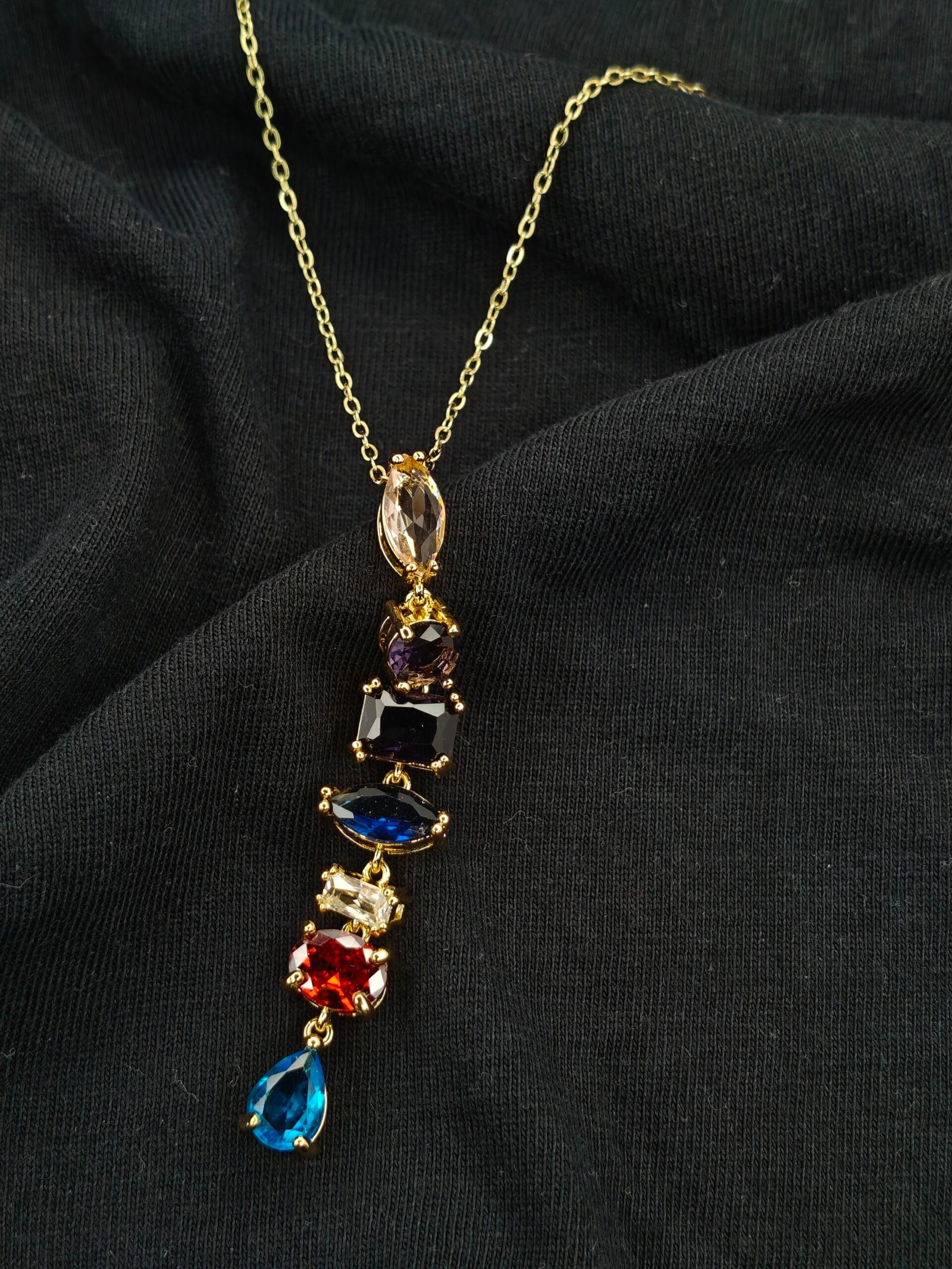 From the soft sparkle of the clear oval stone at the top to the rich tones of deep purple, midnight blue, fiery red, and a striking teardrop blue at the base, every gemstone adds its own unique brilliance. The cascading design creates a graceful, elongated silhouette that enhances the neckline and draws attention effortlessly.