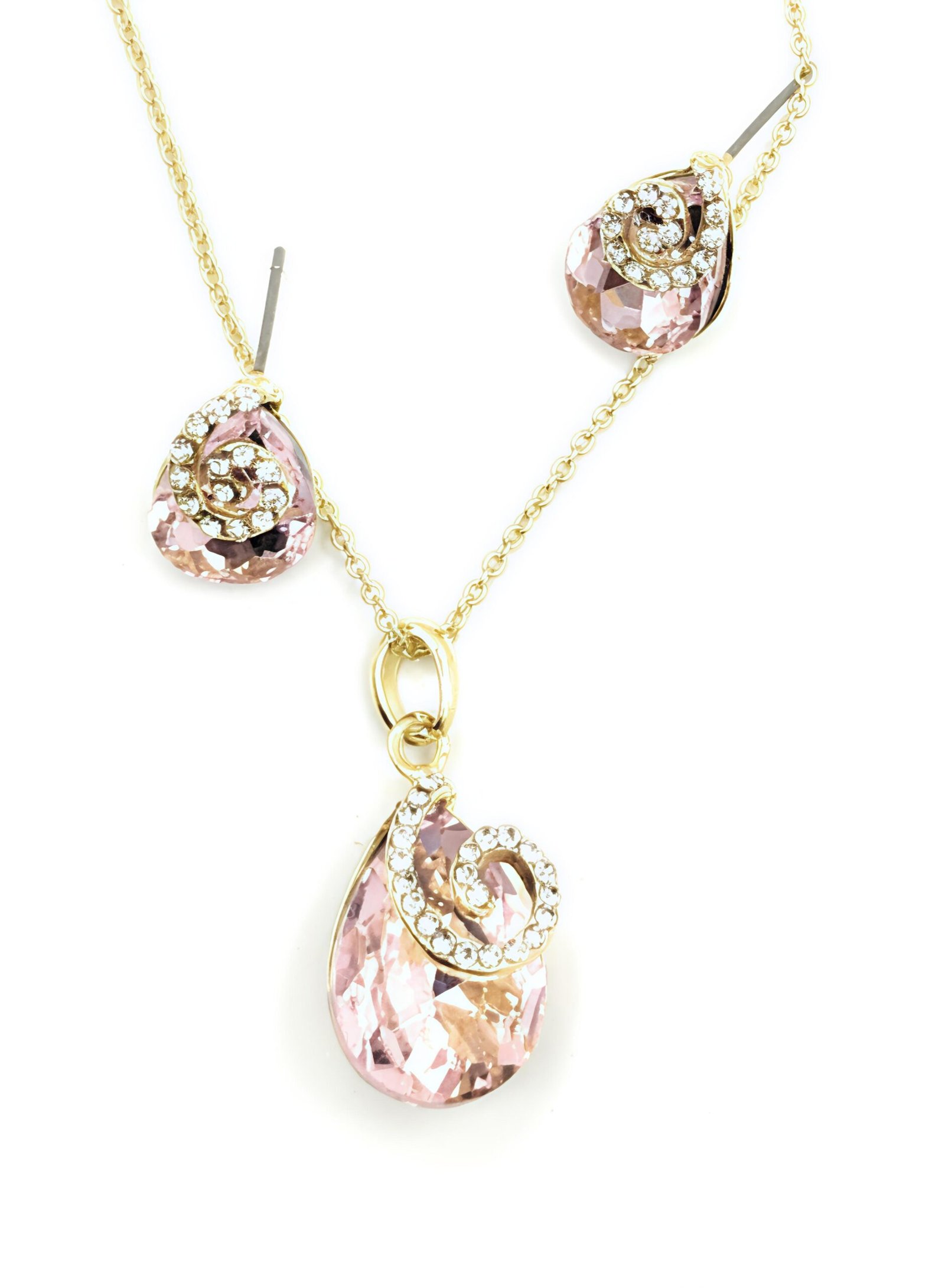 Add a touch of sparkle and sophistication to your look with this elegant pink crystal jewelry set. Featuring a beautifully faceted teardrop-shaped pink crystal, the necklace pendant is designed with a graceful swirl of shimmering stones set in a gold-tone finish, creating a luxurious and feminine appeal.