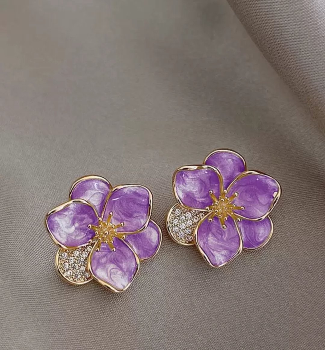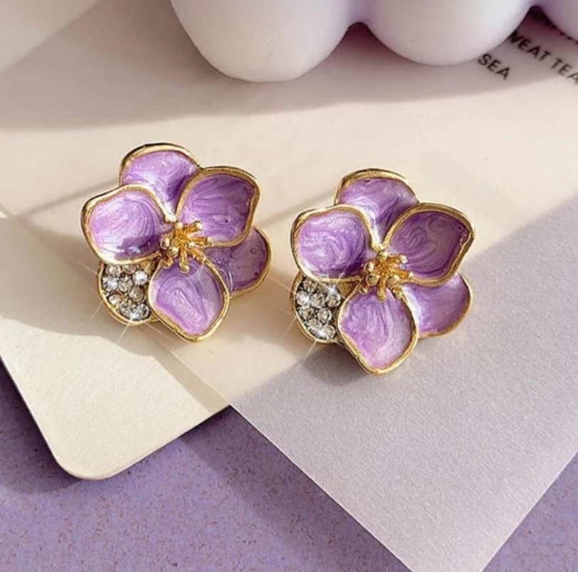 Add a fresh and feminine touch to your jewelry collection with these Purple Floral Enamel Stud Earrings. Designed in a charming flower shape, these studs feature glossy purple enamel petals outlined in a delicate gold-tone finish. The center is beautifully detailed with fine golden accents, while a crystal-studded leaf adds a subtle sparkle for an elegant finish.