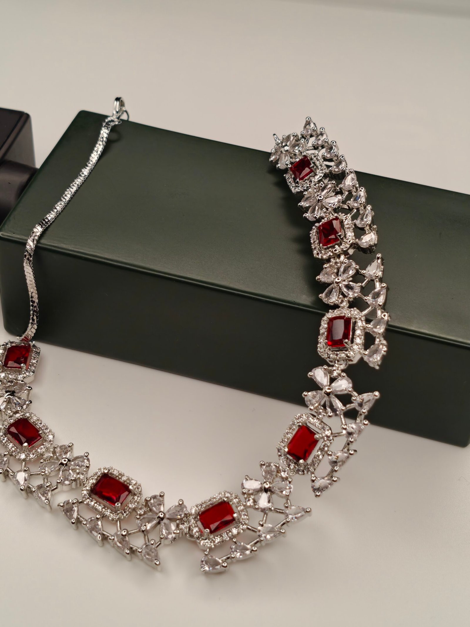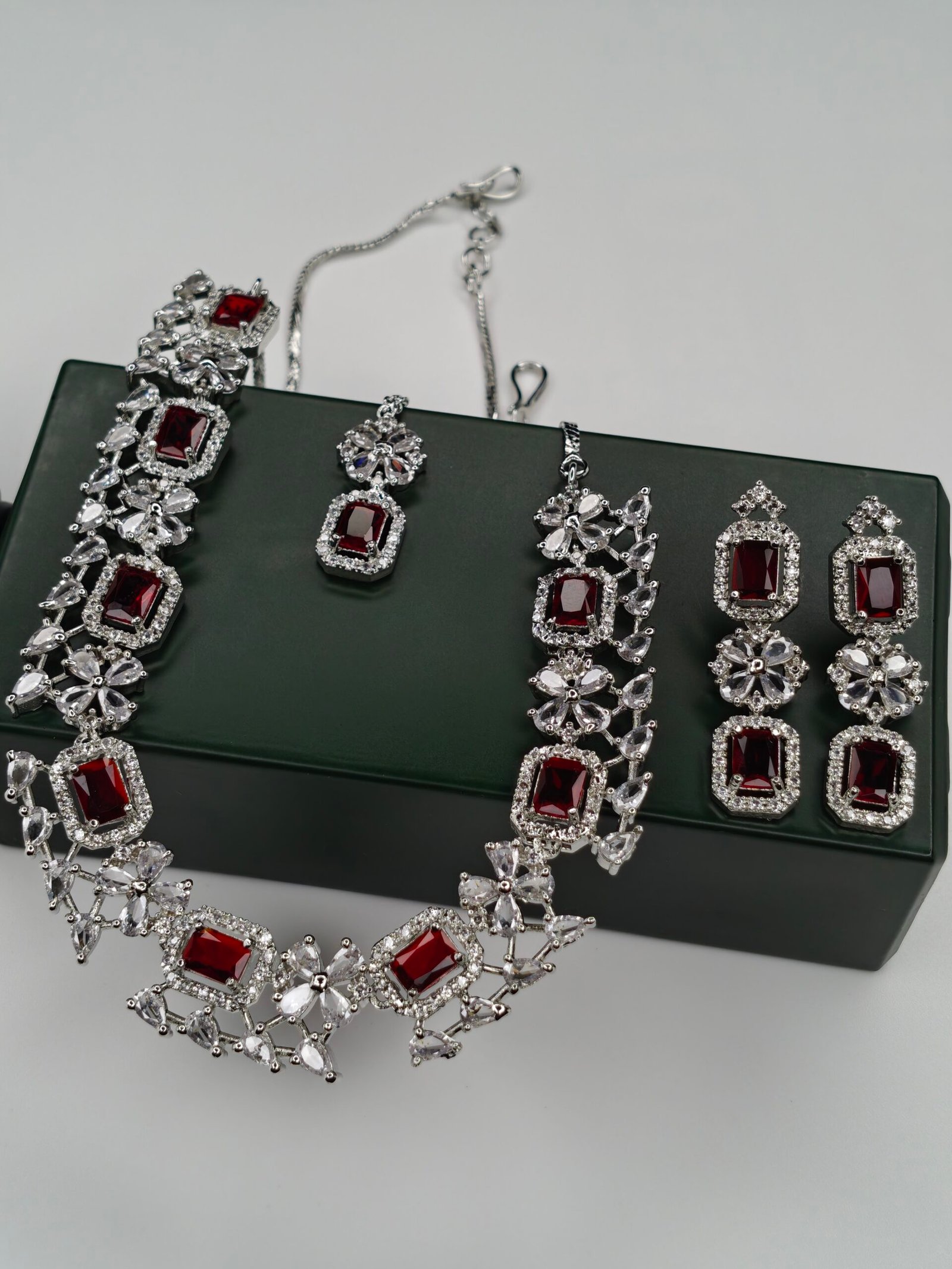 Turn every occasion into a grand affair with this exquisite ruby-inspired jewelry set, designed to radiate elegance and timeless charm. Featuring a stunning necklace, matching bracelet, and coordinated drop earrings, this set is the epitome of luxury craftsmanship.