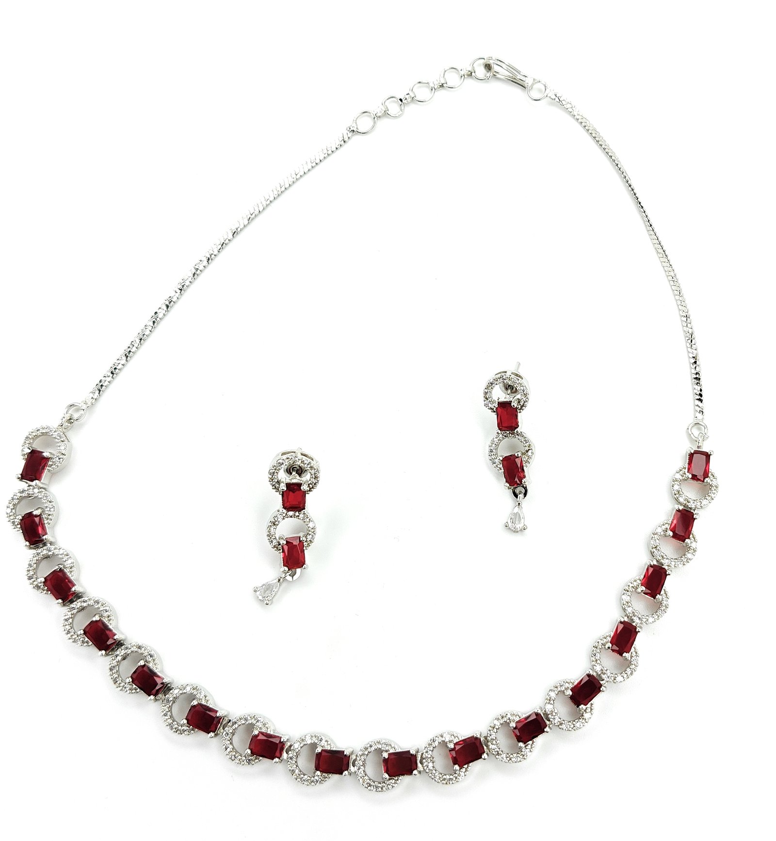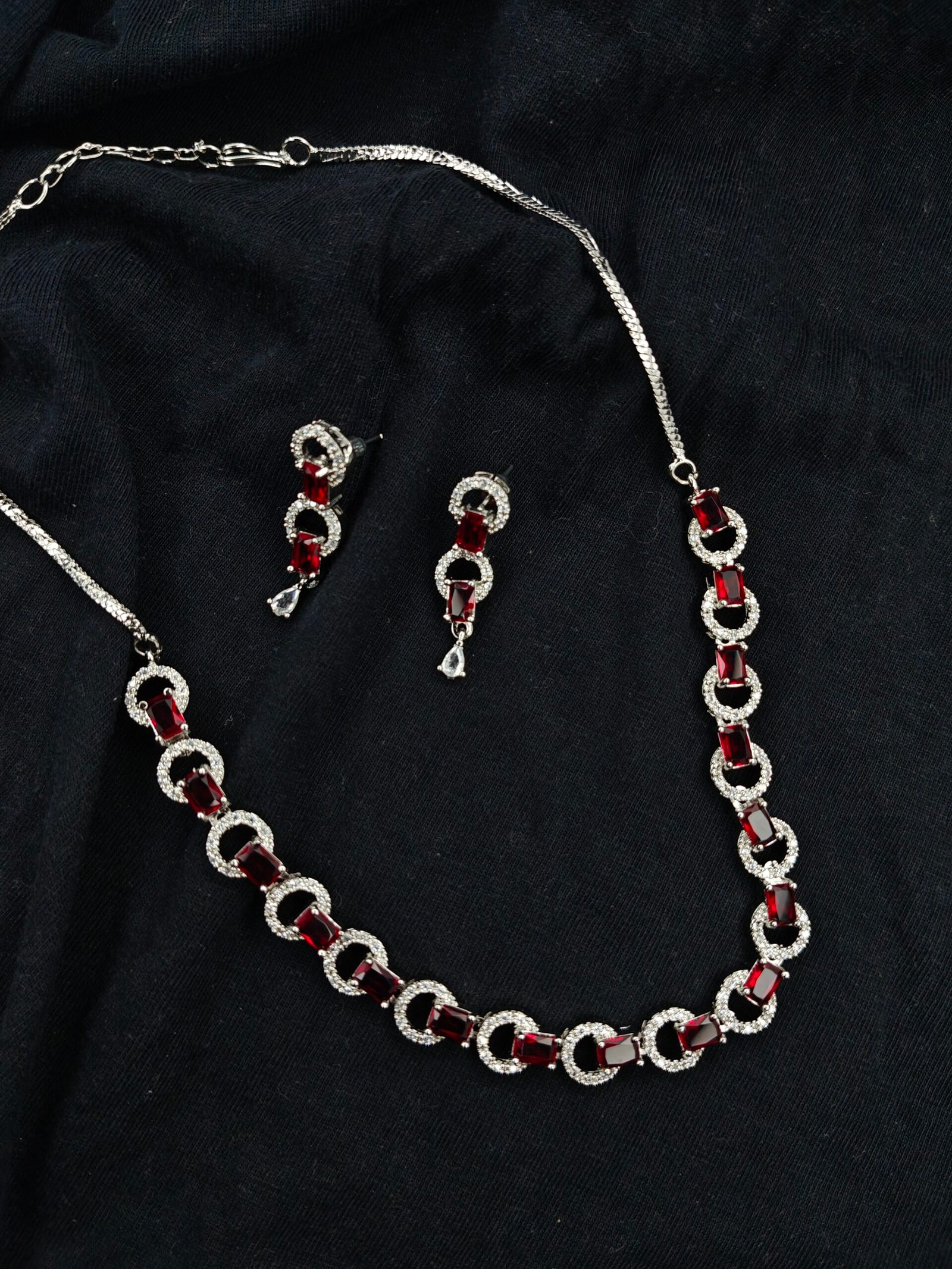 This stunning jewelry set, designed to make every moment shine. Featuring a beautifully coordinated necklace and matching earrings, this set showcases rich, ruby-red rectangular stones that radiate sophistication and charm.