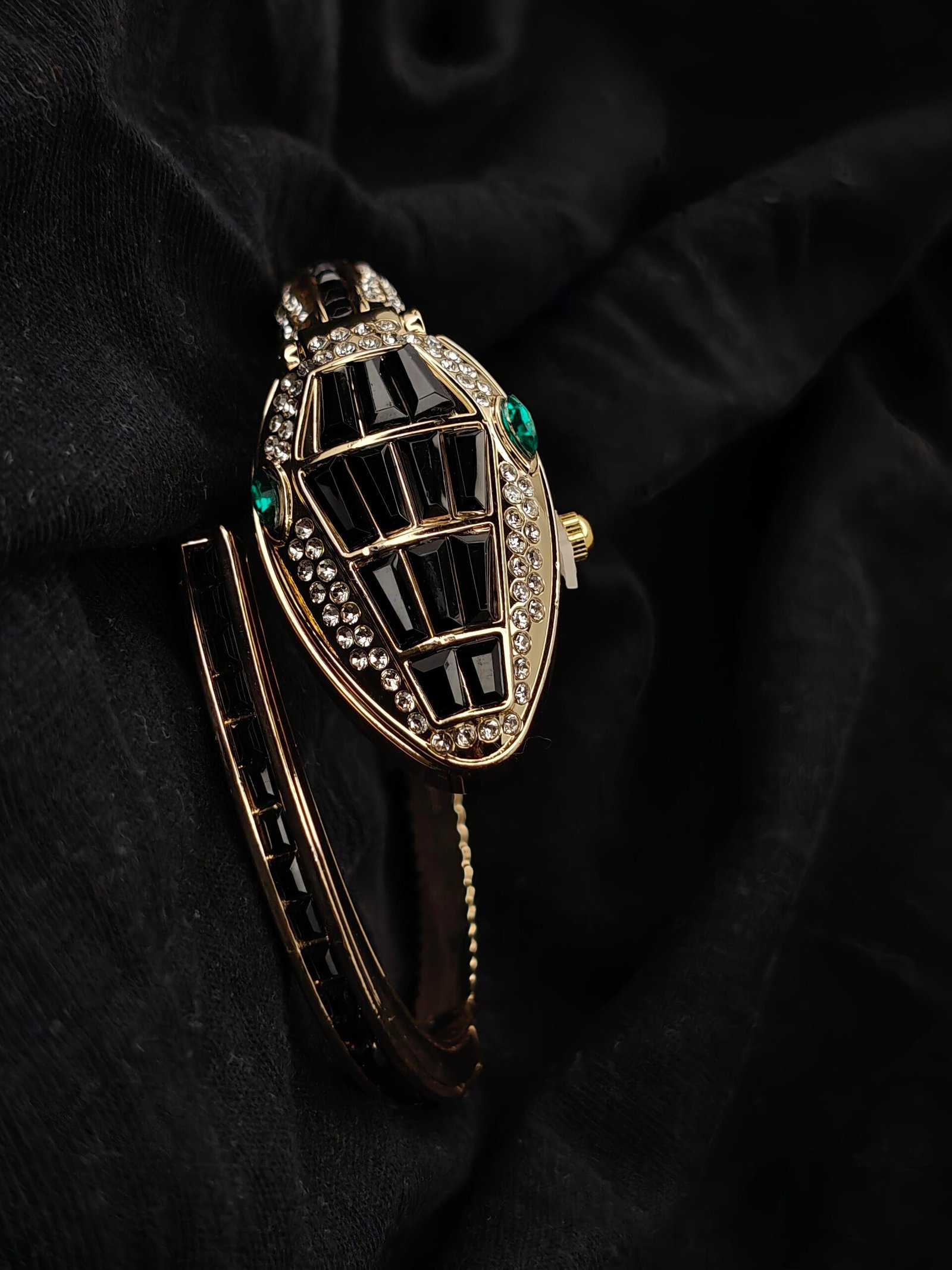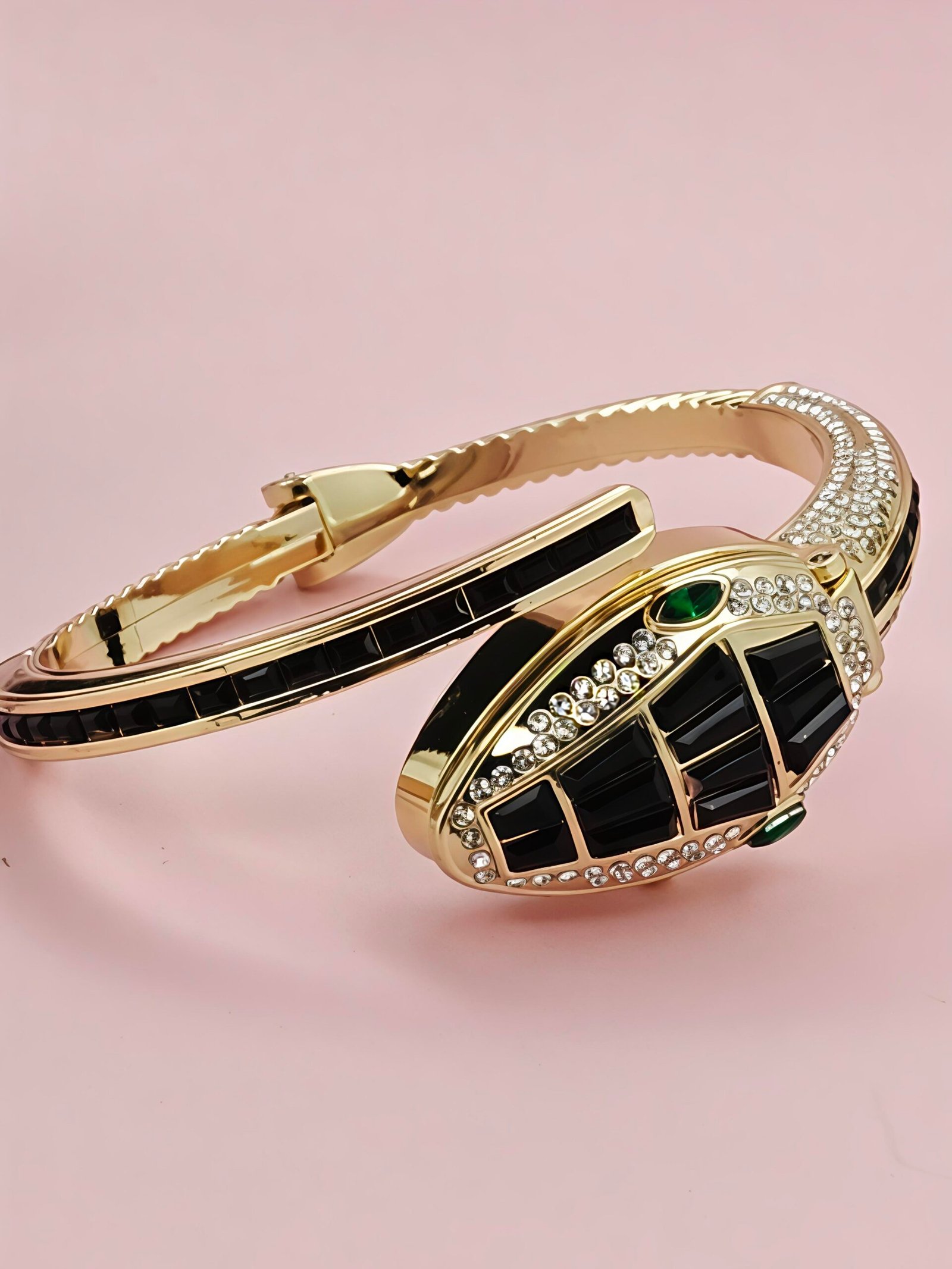 This bracelet watch features a unique snake-inspired design with diamond-like accents for a luxurious look. Open bracelet design offers flexibility to comfortably fit various wrist sizes. Crafted with high-quality materials, lightweight comfort for everyday wear.