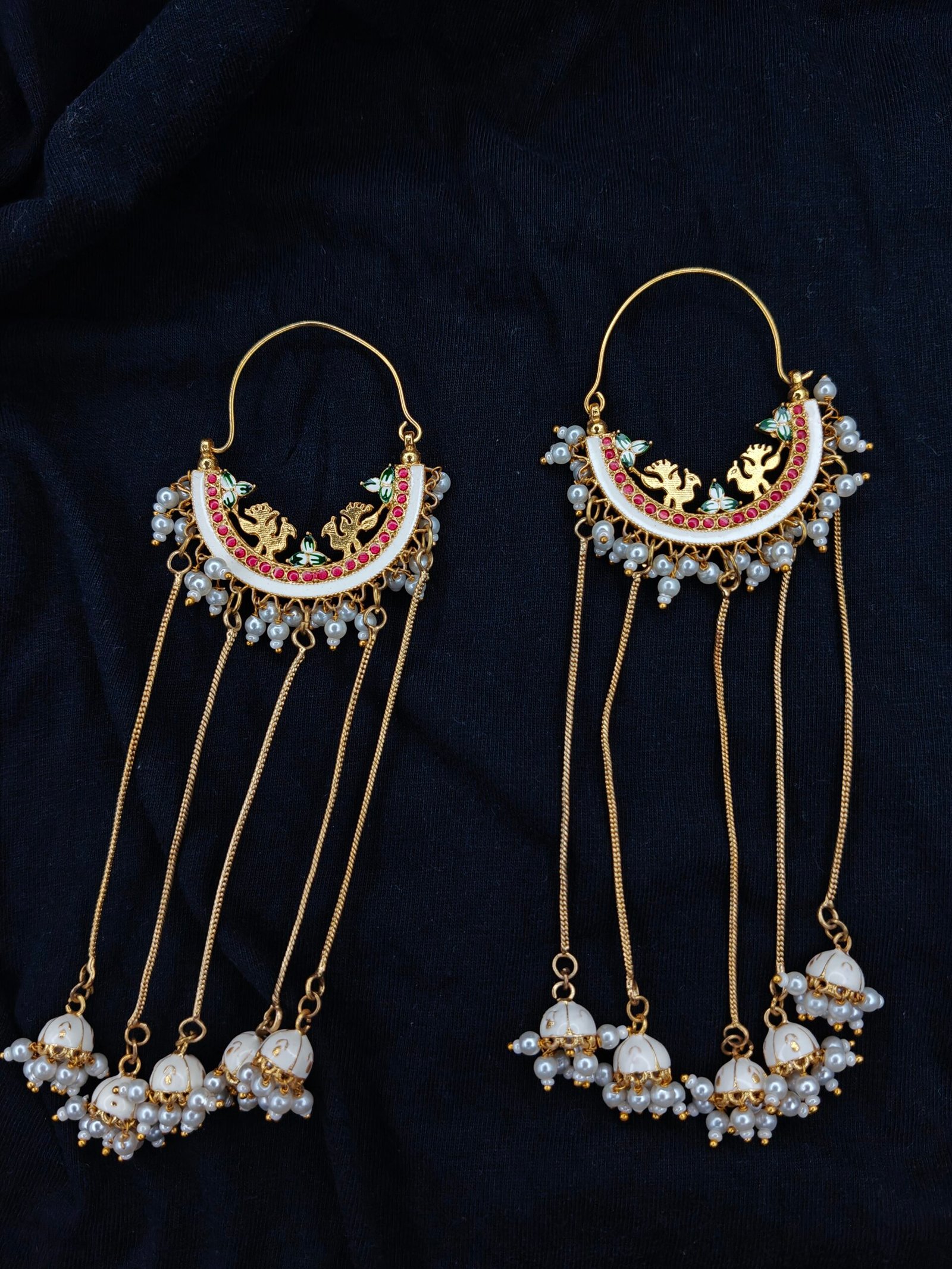 The earrings are adorned with multiple dangling chains, each ending in stunning white enamel beads and clusters of lustrous pearls, creating a graceful movement with every step. Lightweight yet statement-making, they are ideal for weddings, celebrations, and special occasions.