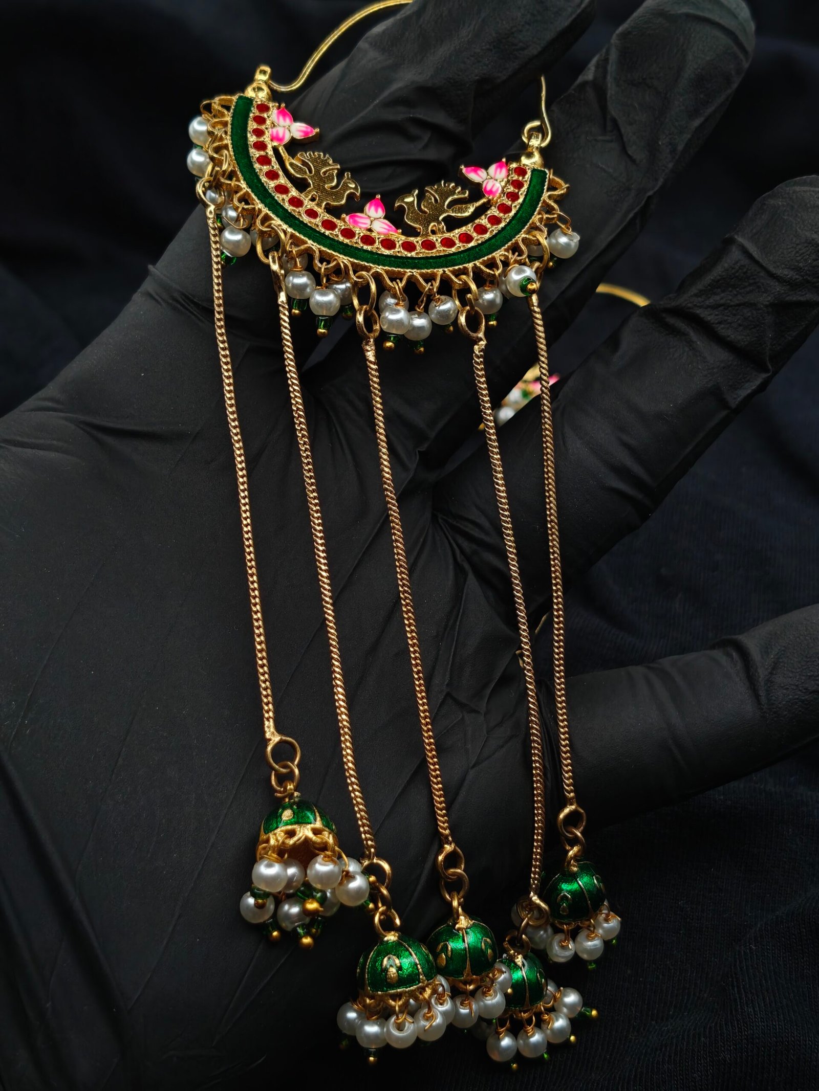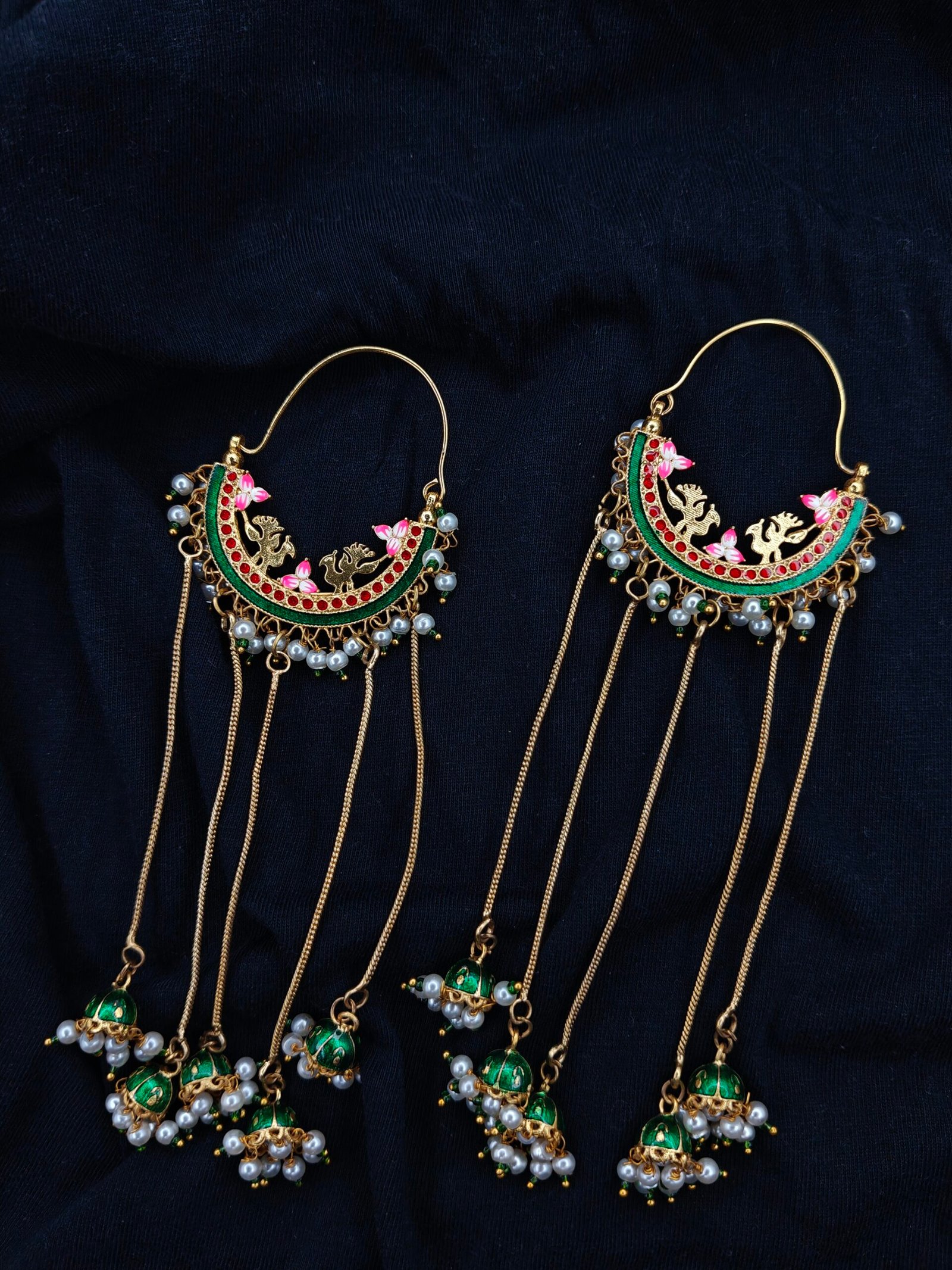 The earrings are adorned with multiple dangling chains, each ending in stunning green enamel beads and clusters of lustrous pearls, creating a graceful movement with every step. Lightweight yet statement-making, they are ideal for weddings, celebrations, and special occasions.