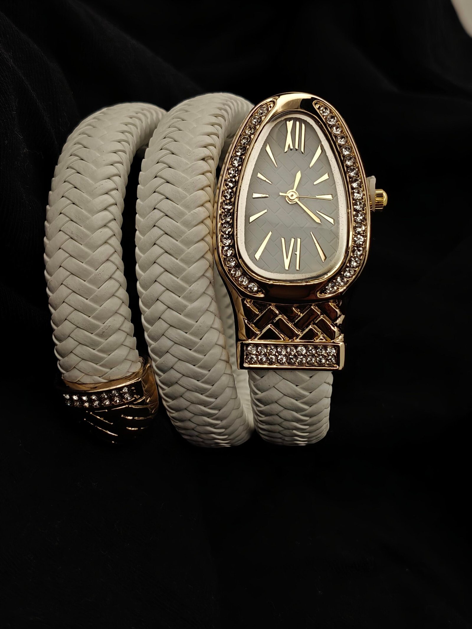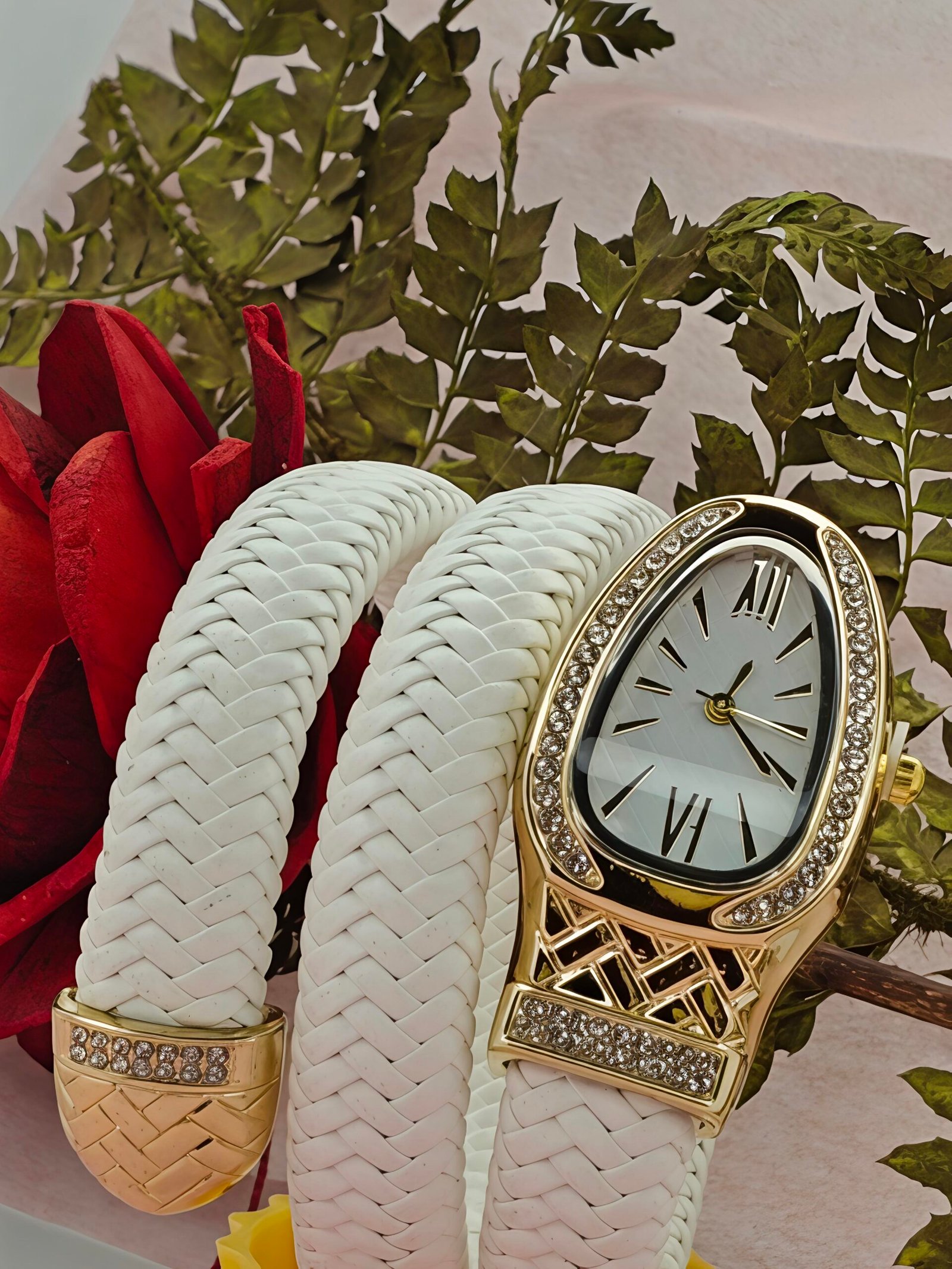 The standout feature is its beautifully woven white strap, crafted for both comfort and visual appeal. The bracelet-style design wraps gracefully around the wrist, offering a secure fit and a fashionable edge. Additional crystal accents on the clasp and side detailing enhance its overall brilliance.